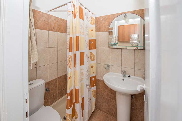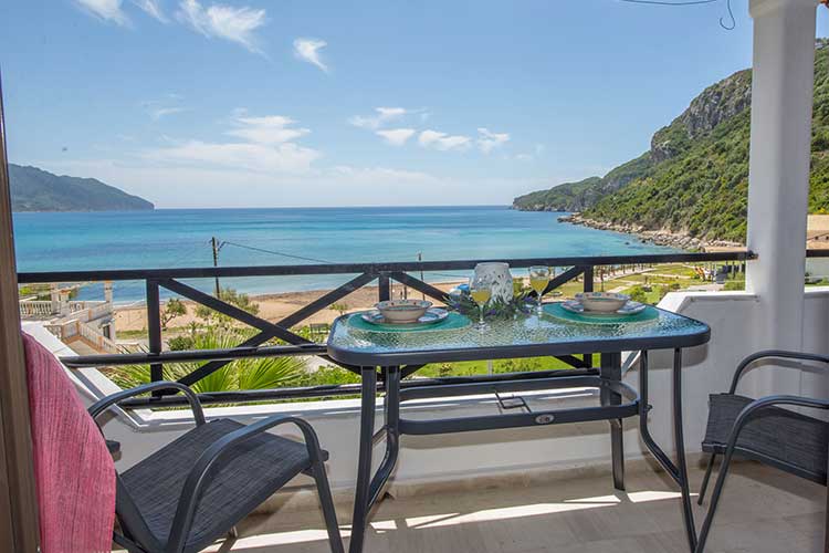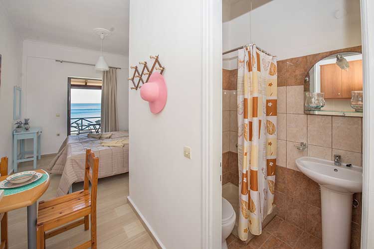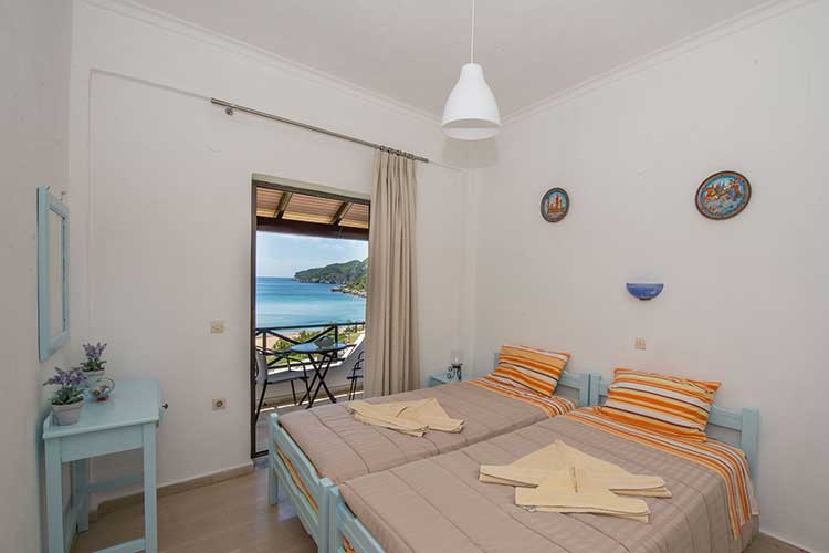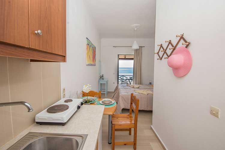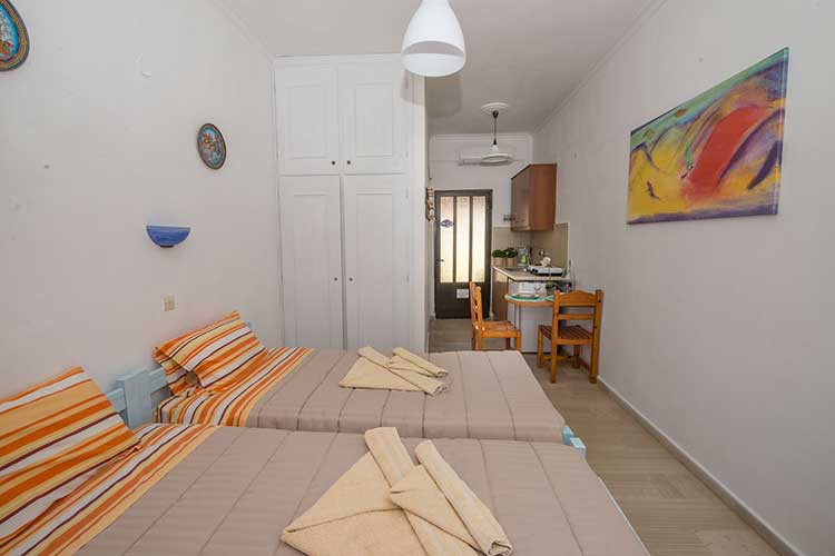 First floor studio of 25sq.m for two guests. Every studio has a small kitchen for cooking with small oven and hobs, kettle, filter coffee machine dishes and utensils and dining table. The bedroom has two single beds and access to a balcony with outdoor furnishers and sea view. Every studio features shower, air-conditioning and free Wi-Fi. Baby cot and high chair are available on request.